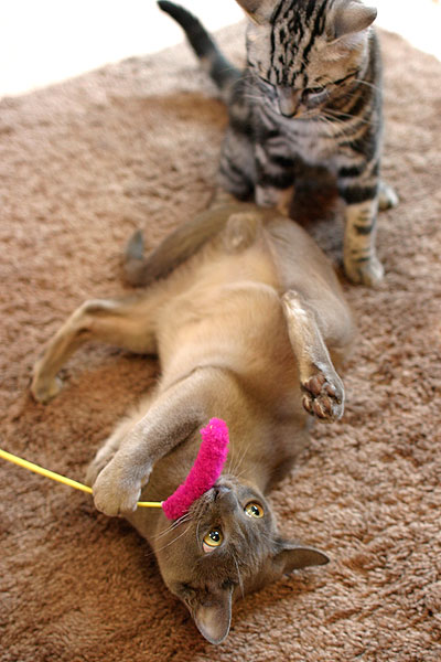 人間の髪型みたいな模様が特徴のチャコちゃん、猫じゃらしを狙ってます。