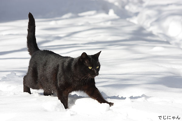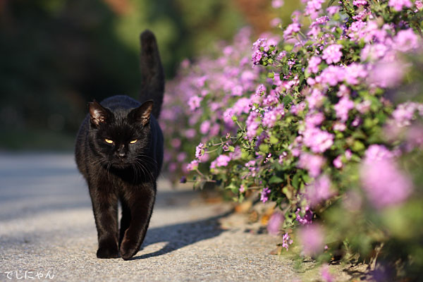 散歩から帰ってきた黒猫さん、どんな天候であろうと毎日の散歩は欠かさない。