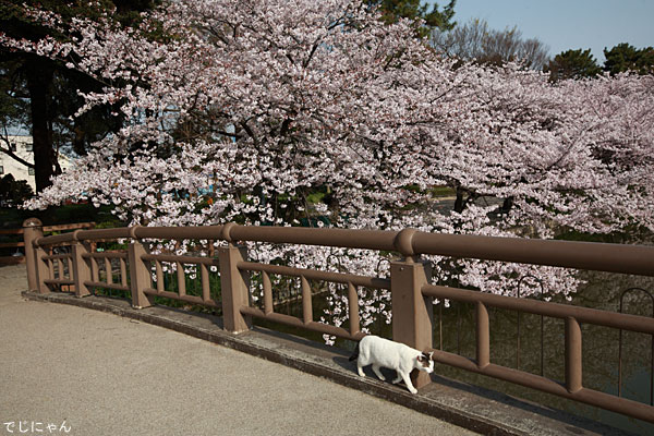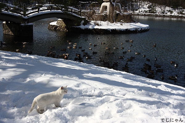 この池には鴨がたくさん住んでいます、白猫のすぐ後ろに休憩所があり、
