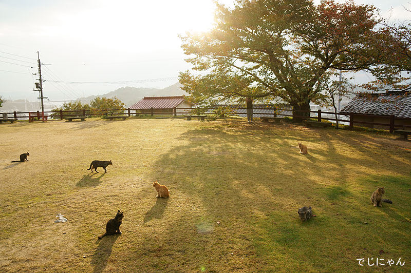 高台にある朝の公園は、猫たちの牧場になってました。