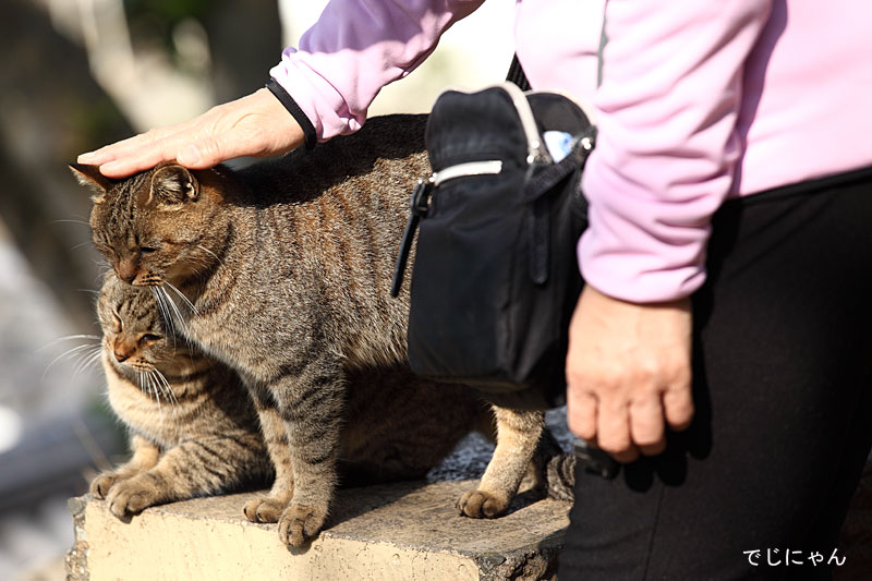 おばちゃんになでなでされてご機嫌な兄弟猫。
