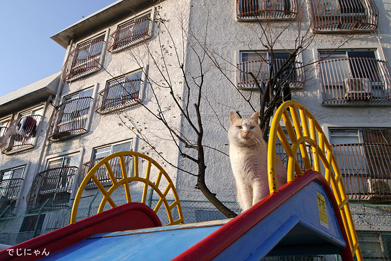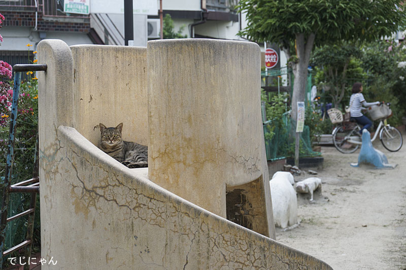 ほとんど使われていない滑り台は猫の隠れ家になってました。