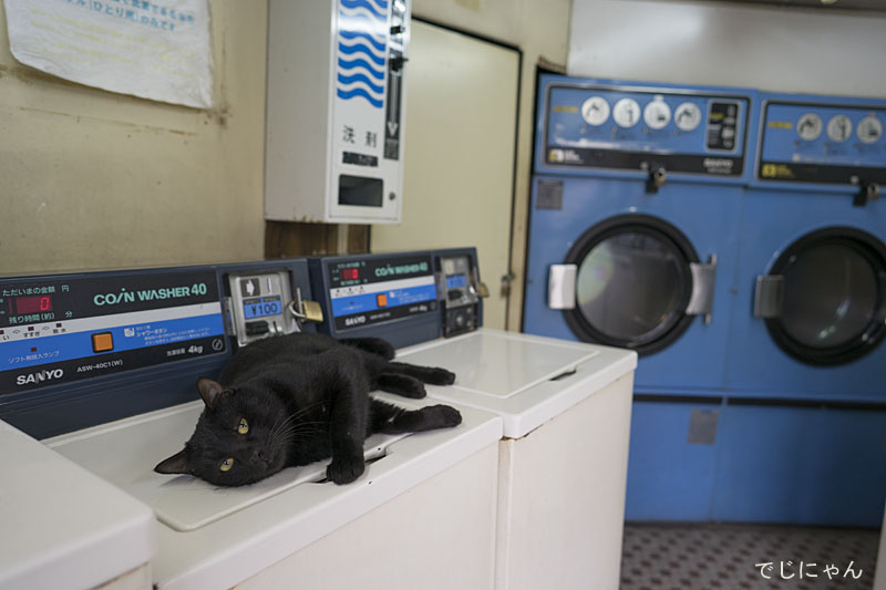 真夏のコインランドリーで涼をとる黒猫さん。