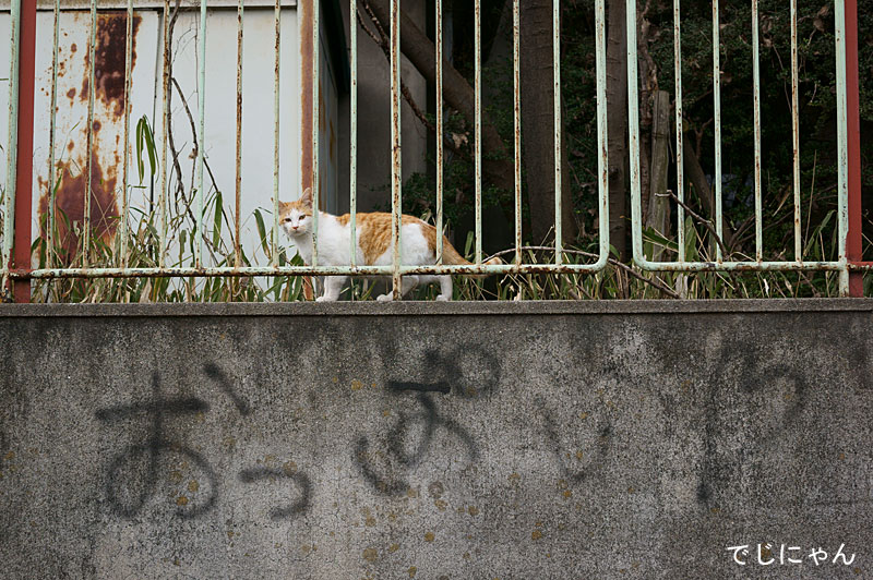 猫の目線の先は、僕の足にまとわりつく三毛猫、まだ親離れしきれてないお年頃。