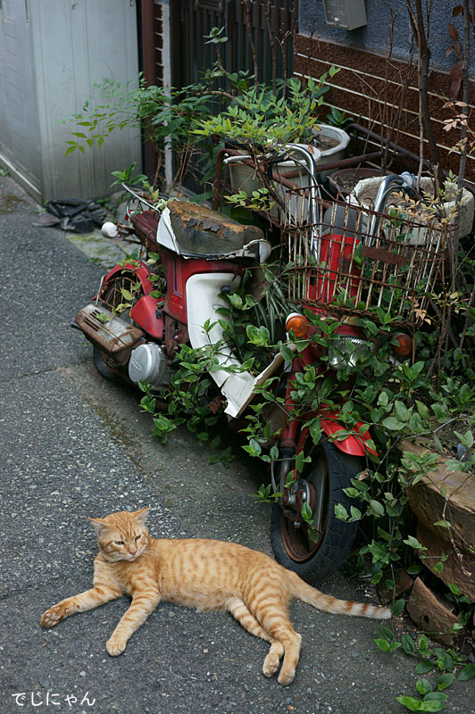 まだ若い茶トラさんでしょうか。バイクの赤と植木の緑が良いアクセントになっていますね^^
