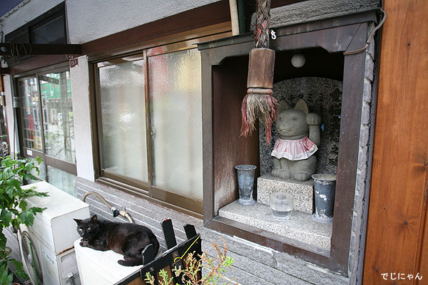 猫たちが集まるこの場所には、珍しい招き猫地蔵があります。