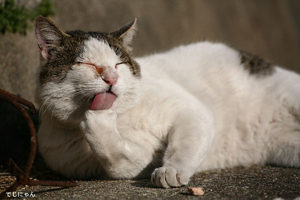 日向でくつろぐボス猫、顔の輪郭がおむすびみたいです。