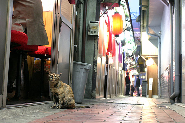 居酒屋のカウンターで、おこぼれを貰おうと待っている猫。