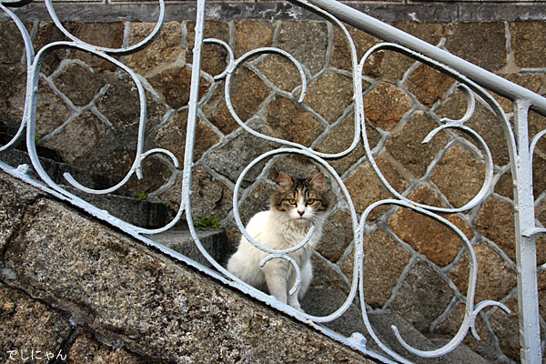 手すりの間から見える顔が、何だか置物と言うか、