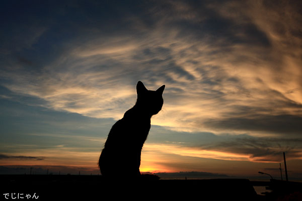 ぽつんと空を仰ぎ見ている猫くんのシルエットが