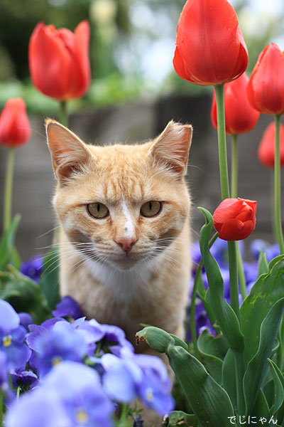 喧嘩でやられたのか、ちぎれた耳の精悍な顔の猫と、美しい花の対比が素晴らしいです。