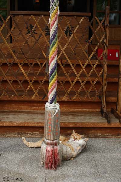 神社の大きなガランガランと猫ちゃん、良い瞬間捉えられましたね。