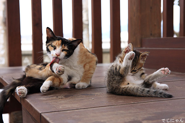 子猫のぎこちない毛繕いがまたかわいい。