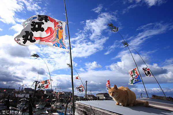 猫たちも日向ぼっこしていました・・・が、これだと旗がなびかない!