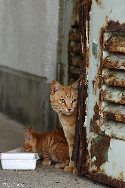 最後の一匹が食べ終わるまでちゃんと母猫が見守っていました。